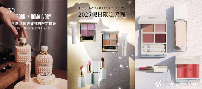 在潘通色发布之前,整个2025年,外资彩妆品牌在“白色风格”上其实已有不少尝试。如SUQQU的“白霜艺术”系列,从冰霜中汲取灵感,打造低饱和的“裸光冰透感”妆容;华伦天奴则直接推出纯白限定包装的铆钉口红与气垫,呼应其品牌经典的极简美学;TOM FORD的“冬日光芒”系列,则以纯白与银色包装细节,诠释雪地光影的柔和光泽。