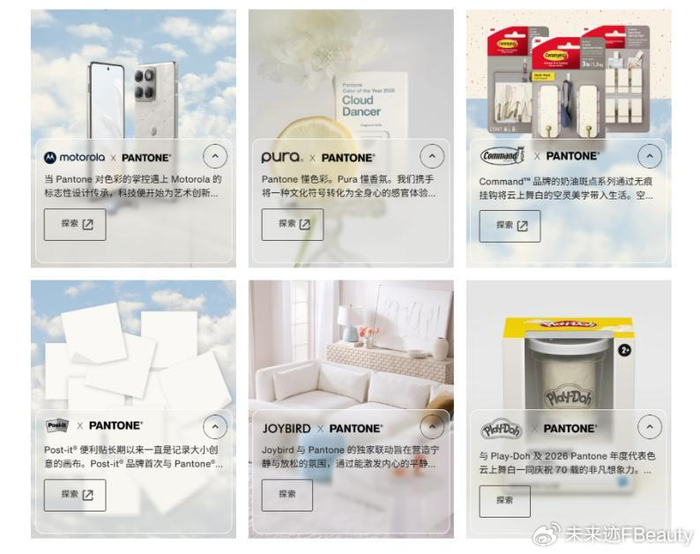 从市场端看,家居行业更青睐与年度潘通色进行官方联名。家具品牌JOYBIRD、文华东方酒店、挂钩品牌COMMAND等纷纷选择有巧思的元素与「云上舞白」相融合。此外,玩具公司培乐多彩泥(PLAY-DOH)、数码品牌联想MOTO(MOTORORA)、3M旗下便利贴品牌The Post-it等品牌也推出了潘通色相关产品。