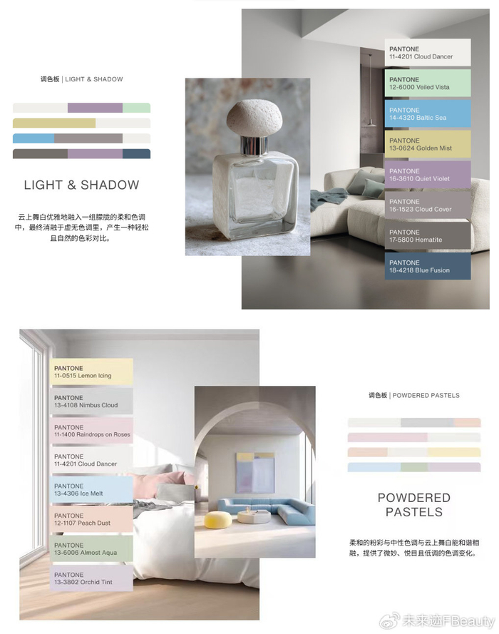 同时,潘通还打造了七款主打这一年度特别色调的调色板,包括粉末柔彩(Powdered Pastels)、休憩时刻 (Light & Shadow)等,为设计领域提供了更多丰富灵感。
