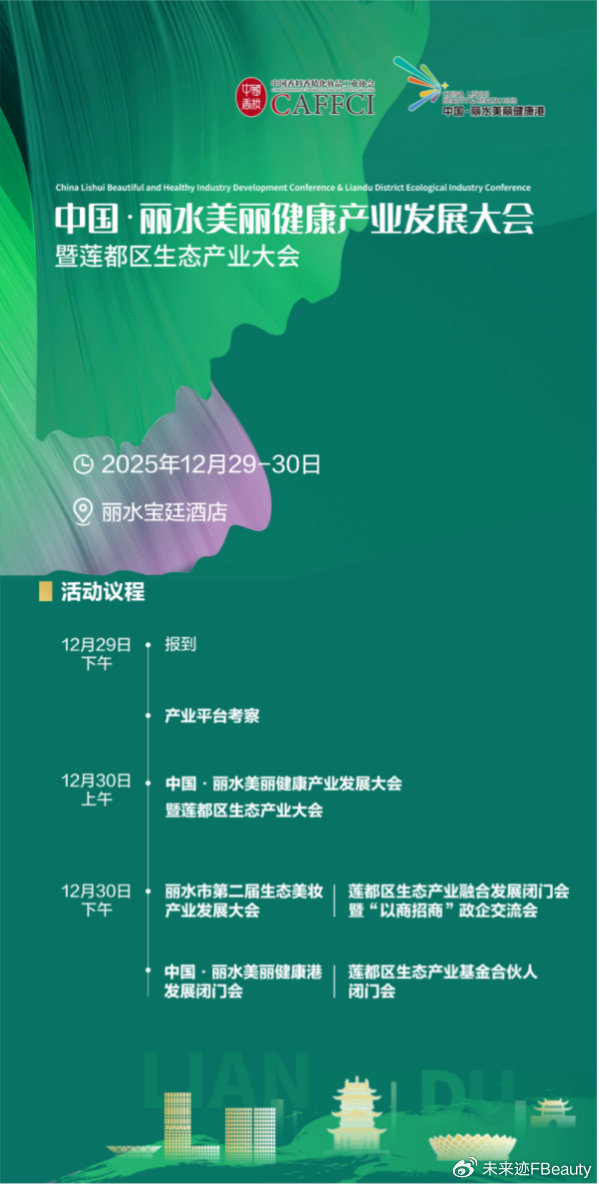 为深入贯彻绿色发展理念,推动美丽健康产业与生态资源深度融合,“中国·丽水美丽健康产业发展大会暨莲都区生态产业大会”将于2025年12月29日至30日在浙江省丽水市莲都区召开。大会将汇聚行业协会、科研机构、企业代表及相关领域专家,共话美丽健康产业高质量发展新路径。