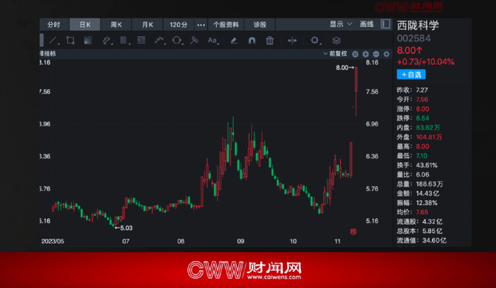 近期,西陇科学股份有限公司(股票简称:西陇科学,股票代码:002584)在市场的关注度可谓是持续暴涨,截止11月10日(本周五)收盘,公司股价已连续3个交易日出现涨停,总是达到了46.82亿。