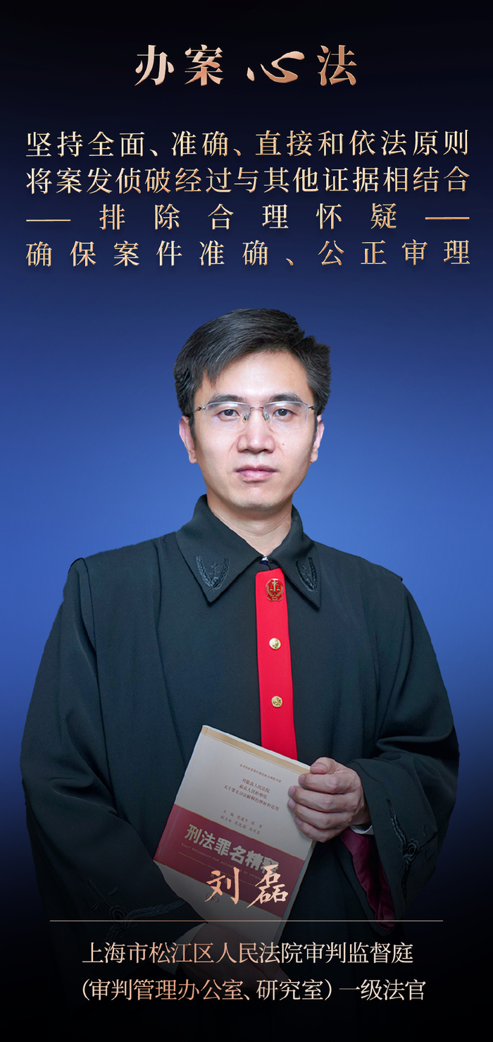 刘磊,中南财经政法大学刑法学硕士,现任上海市松江区人民法院审判监督庭(审判管理办公室、研究室)一级法官,曾任青海省果洛藏族自治州中级人民法院院长助理(挂职)。获评平安上海建设先进个人、上海法院审判业务骨干等,入选上海法院审判实务专家库。主审并撰写的2件案件获评最高人民法院优秀案例、1件案件入选上海法院优秀裁判文书、2件案件入选上海法院示范庭审,撰写的1篇案例入选“两高”依法惩治危害税收征管典型刑事案例、4篇案例被最高人民法院年度案例和《刑事审判参考》录用、6篇案例被《上海审判实践》录用。撰写的论文获评上海法院2022年优秀学术讨论会论文,参与撰写的1篇审判白皮书获评上海法院2023年十佳优秀司法建议,参与审理的1件案件入选上海法院依法保障民营企业健康发展典型案例。