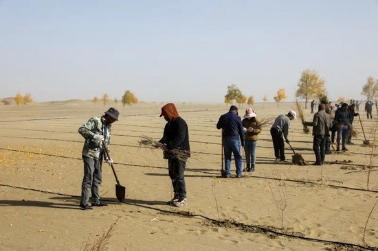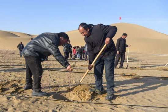 在民丰县后河坝治沙区造林现场,风沙弥漫却挡不住人们的热情。工作人员正忙着挖坑、栽种、浇水,每一道工序都一丝不苟,沙枣苗被他们小心翼翼地植入沙地。这些沙枣苗耐旱、耐寒、耐盐碱,能够在恶劣环境中顽强生长,工作人员严格遵循科学造林方法,确保成活率。