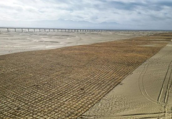 密密麻麻的草方格将沙漠牢牢“锁”住,为交通提供保障。地区融媒记者 许晓龙 摄