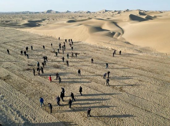 在于田县奥依托格拉克乡一处防沙治沙区,数十名工人正忙着铺设草方格,一眼望去,像是给沙漠披了一件“格子衫”。