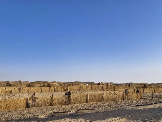 有地下水的地方采取生物治沙,而没有地下水、沙丘较大的地方,如何治?工程固沙模式应运而生,芦苇秆就成了治沙“利器”,治沙人将芦苇秆制作成草方格和高立式沙障与风沙对抗。