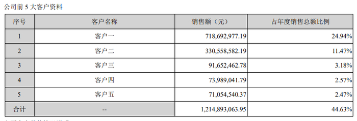 财报显示,公司前五大客户的销售额分别为7.2亿元、3.3亿元、9165万元、7399万元、7105万元,分别占年度销售总额的比例为24.94%、11.47%、3.18%、2.57%、2.47%。前五大客户合计销售金额占年度销售总额的比例为44.63%。
