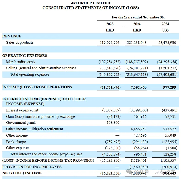 财务数据显示,公司在2024财年(截至9月30日)营业收入为28,475,930美元,净利润904,643美元;2023年(截至9月30日)营业收入为119,097,976港币,亏损26,282,350港币。
