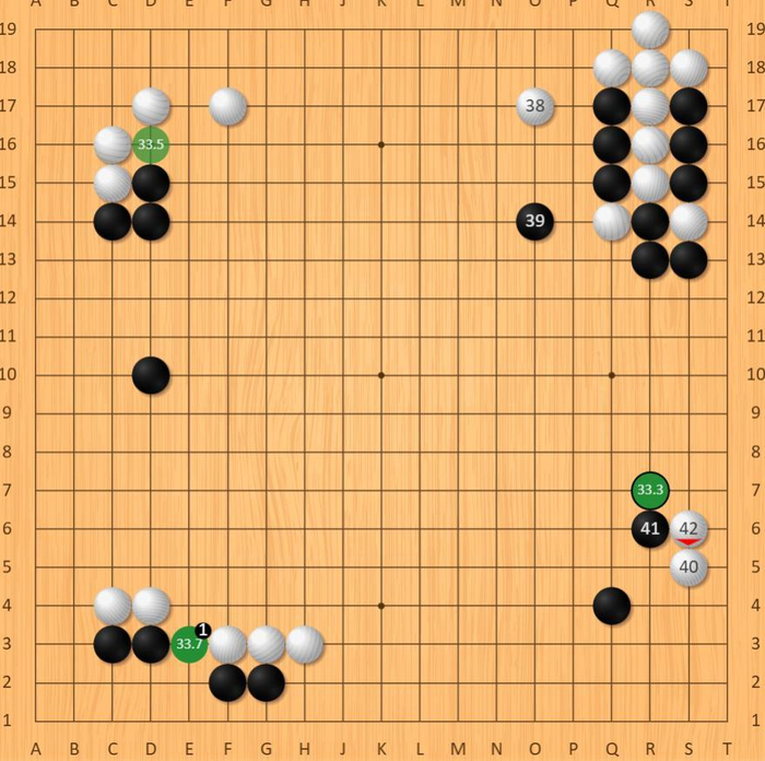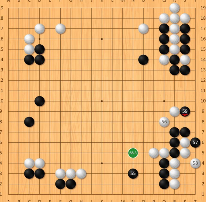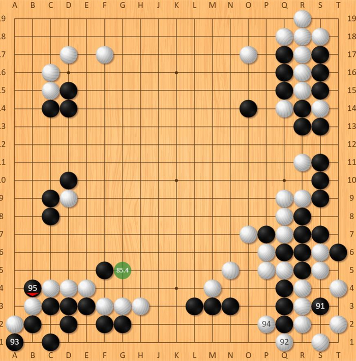 这样,双方持续在棋盘中下展开厮杀,白棋的李维清九段在抢占右下实地和中腹势力之后,不到百手便手握九成胜率,向着胜利前进!