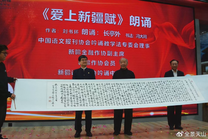为展现会客厅“文化厚重、资源汇集”的定位,仪式特别邀请了新疆著名本土歌唱家栾立君老师献唱,以及新疆著名辞赋家刘书环老师与、书法艺术家冯大同老师上台展示“爱上新疆赋”。中国语文报刊协会吟诵教学法专委会理事、新疆诗词学会吟诵中心主任、乌鲁木齐市诗词楹联家协会副主席长亭外老师对作品进行了精彩朗诵,赢得了现场观众的热烈掌声。新疆著名书法家席时珞老师上台捐赠了书法作品,表达了对其文化事业的支持与热爱。