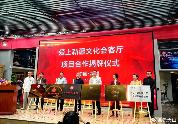在热烈的掌声中,北京曜阳公益基金会王艳明秘书长、新疆维吾尔自治区文化市场发展促进会支天文会长、新疆维吾尔自治区旅游协会张晓宇会长、全景云融媒体运营中心主任曾斌、爱上新疆商务管理(新疆)有限公司书记李青等共同为“爱上新疆文化会客厅”揭牌,标志着这一文化平台正式启航。