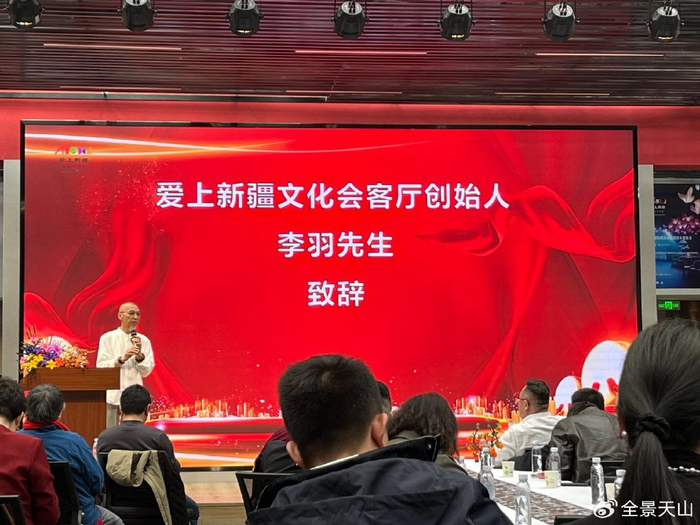 仪式上,新疆西域民间艺术文化研究院院长、“爱上新疆文化会客厅”创始人李羽发表致辞,强调了”文化润疆“的重要性,并展望了会客厅在推动新疆文化传播和商务合作中的重要作用。他说,在当今信息多元、社交互动频繁的时代背景下,人们渴望有一处兼具深度交流与轻松氛围的空间,能够汇聚各界精英、不同领域的代表人物以及广大对文化艺术感兴趣的受众。会客厅就是一个汇集地方特色资源,融合文化、娱乐与商业功能于一体,构建开放、多元、包容的交流平台,通过高质量的对话与互动,思想碰撞、传播有价值的观点,打造一个具有广泛影响力的独特魅力的社交平台,让参与者能在这里收获知识、拓展人脉、共享多元视角,以此推动新疆与外界的沟通和合作。