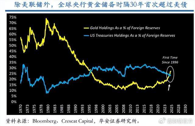 曾经全球央行的储备资产里,美债是重要的压舱石。但如今风向变了,全球央行黄金储备30年来首次超过美债持有量,我国央行更是连续11个月增持黄金,储备规模直接突破2300吨。(来源:Wind)
