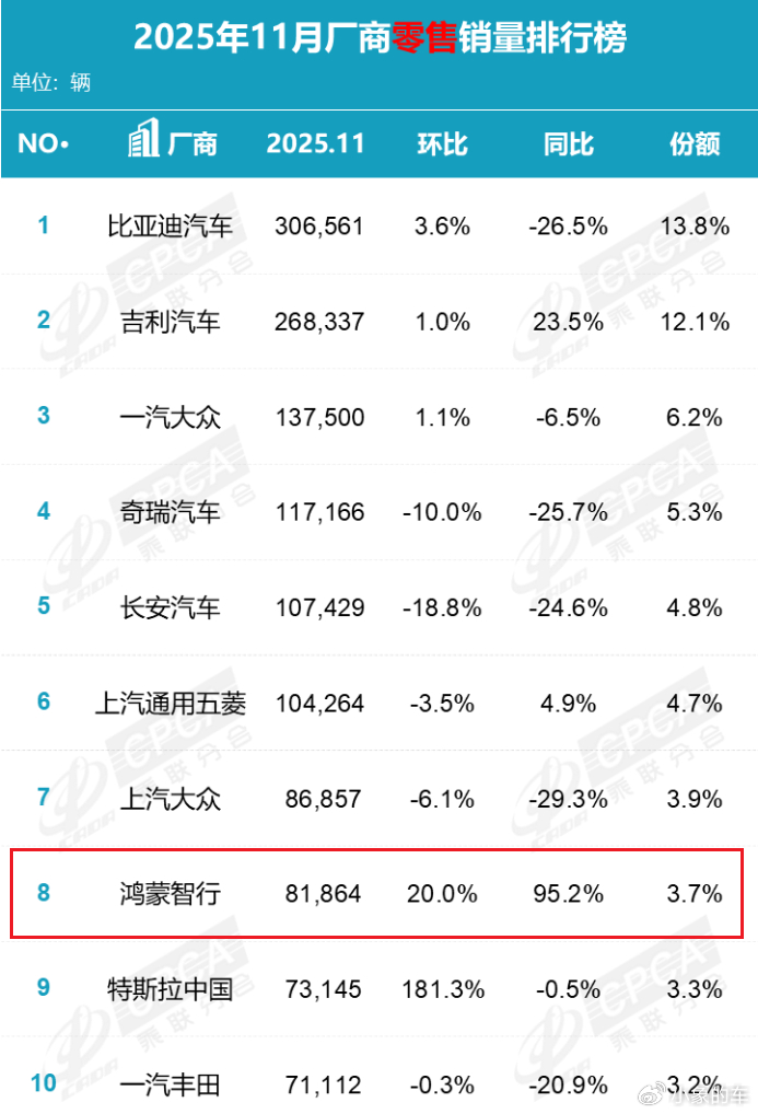 背靠华为这棵参天大树,鸿蒙智行展现出强大的市场号召力,跻身零售十强榜单。
