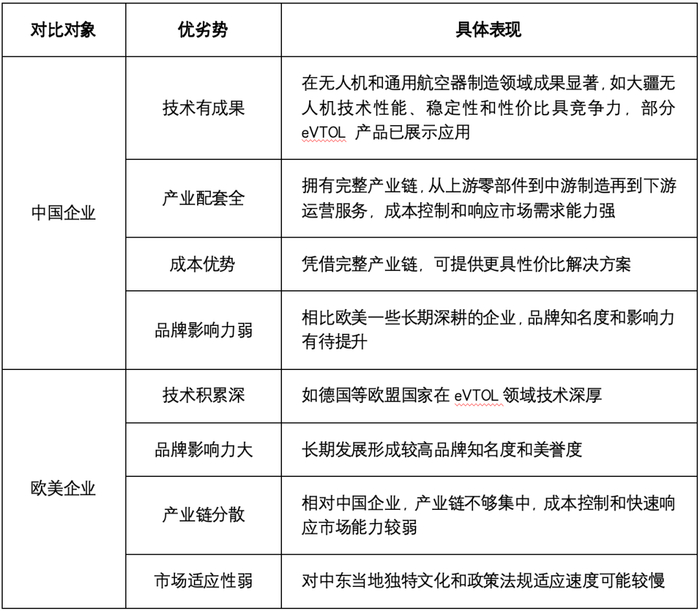 ▲ 中国与欧美低空经济企业在中东竞争优劣势对比