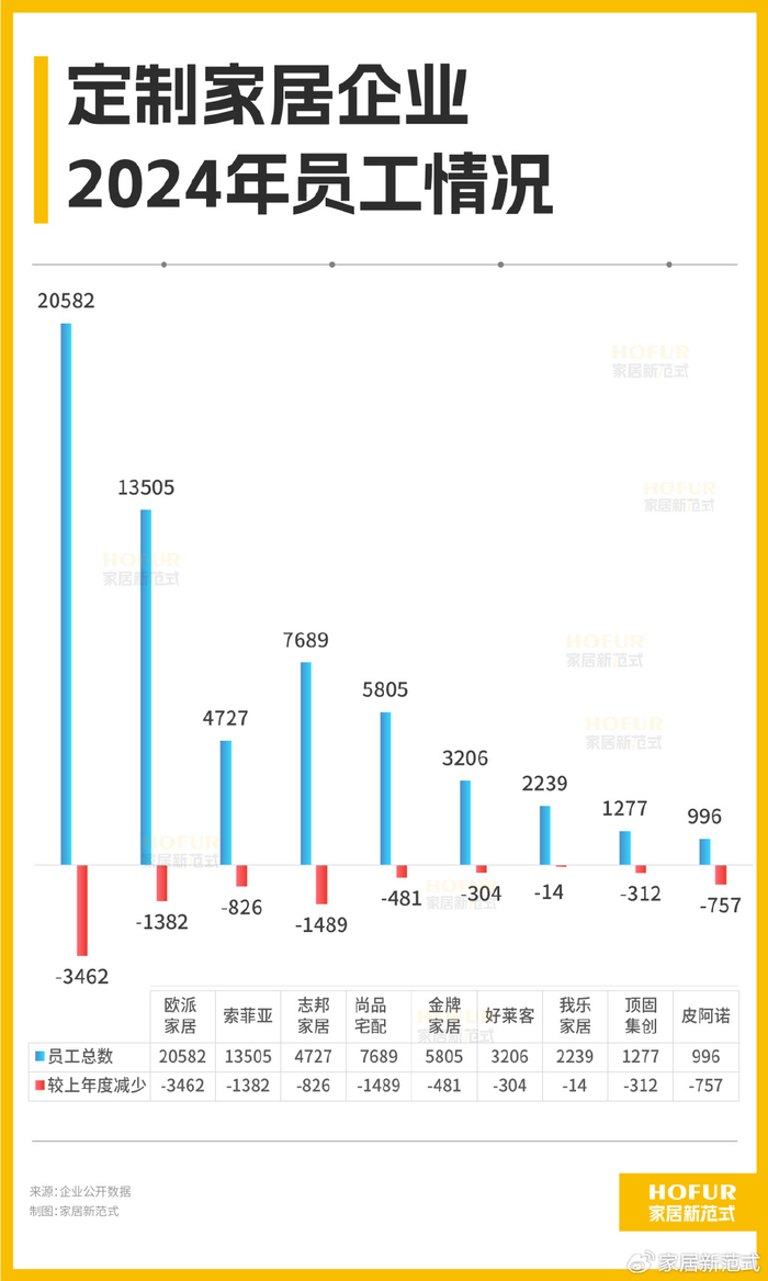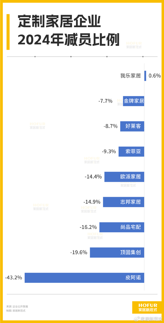 从减员比例来看,以2023年底财报里9家企业员工总数69025人来计算,相当于2024年共减员13%之多。按排名列,皮阿诺、顶固、尚品宅配、志邦、欧派的减员比例分别达43.2%、19.6%、16.2%、14.9%、14.4%。