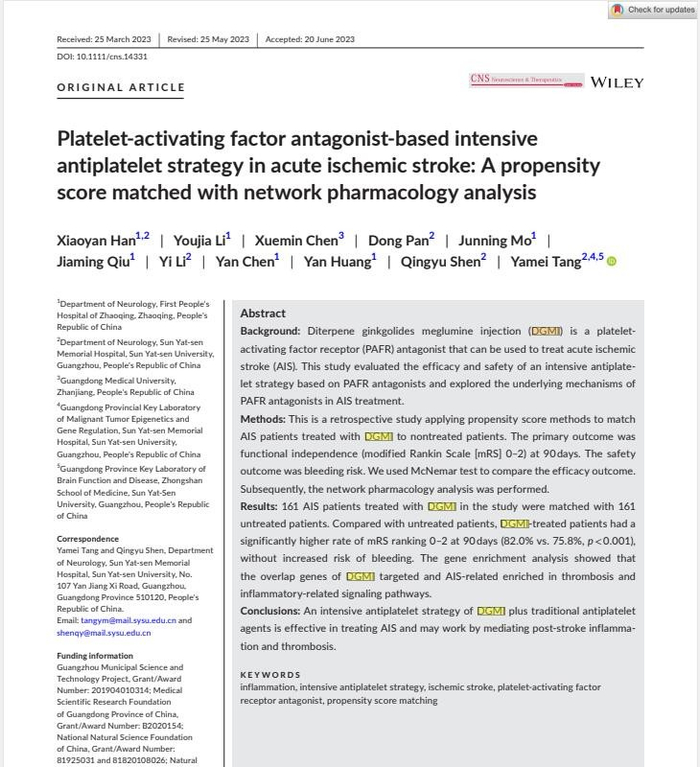 近日,康缘药业PAFR拮抗剂银杏二萜内酯葡胺注射液(英文名:DGMI)临床研究论著“Platelet‐activating factor antagonist‐based intensive antiplatelet strategy in acute ischemic stroke: A propensity score matched with network pharmacology analysis”(中文《基于血小板活化因子拮抗剂的急性缺血性卒中强化抗血小板策略:倾向评分与网络药理学分析的匹配》)在国际神经医学TOP期刊《CNS Neuroscience & Therapeutics》(中科院医学类1区,TOP期刊,2022年影响因子5.5分)发表。