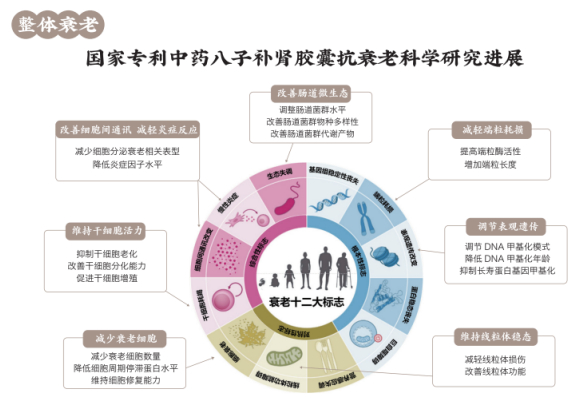吴以岭教授以气络学说精气神理论指导抗衰老研究,研发而成创新中药八子补肾胶囊,是补肾精、抗衰老的专利产品,帮助机体实现由内而外年轻态。八子补肾胶囊是用菟丝子、枸杞子、五味子、蛇床子、金樱子、覆盆子、韭菜子、川楝子八个补肾精的种子药作为方子的核心,加人参扶元气,生地黄滋肾阴,鹿茸、海马等成分,维持干细胞功能,减少衰老细胞及改善衰老相关因子的表达。