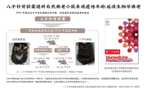 此前,一篇题为《八子补肾延缓自然衰老小鼠表观遗传衰老并延长其健康寿命》的研究论文,发表在了国际药学领域权威杂志《生物医学与药物治疗》上。论文指出,研究人员首次揭示了创新中药八子补肾胶囊通过逆转DNA甲基化水平而延缓整体衰老的作用机制。