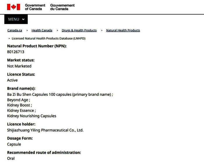 图为八子补肾胶囊在加拿大卫生部官方网站的注册查询结果据了解,中药在加拿大归属于“天然健康产品(NHP)”,进入市场前需经过加拿大卫生部上市前审评,提交产品的安全性、有效性等证明资料并申请注册才能获得NPN文号。八子补肾胶囊获得NPN文号,进一步证实了该药的安全性和有效性。