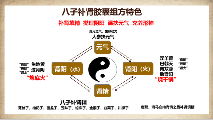 吴以岭教授对2000年来的补肾方剂进行了系统研究,传承创新研发了抗衰老中药八子补肾胶囊。该药是以气络学说精气神理论为指导,以8种种子药滋填肾精为主,药用菟丝子、枸杞子、五味子、蛇床子、金樱子、覆盆子、韭菜子、川楝子,药专力宏;生地黄滋肾阴,淫羊藿、巴戟天、肉苁蓉温扶肾阳,以燮理阴阳,使阴阳相生,阳得阴助,生化无穷,阴得阳助,泉源不竭。