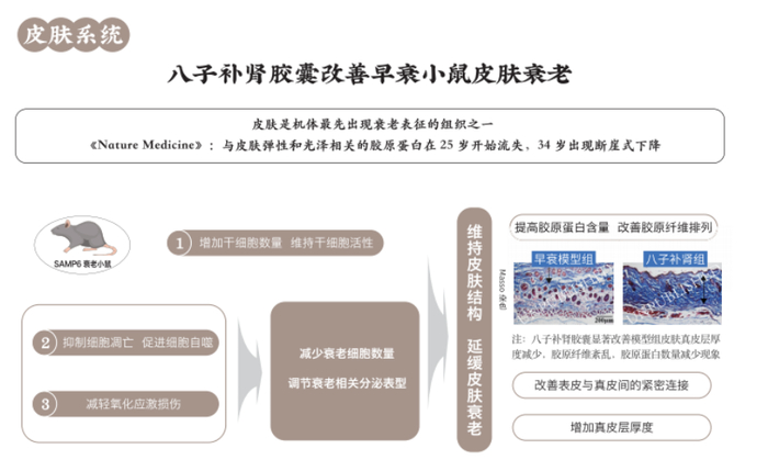 在近期举行的第二届中医药抗衰老大会上公布的临床与实验研究表明,创新中成药八子补肾胶囊能明显增强皮肤微循环,提高皮肤干细胞活力,帮助维持细胞修复更新能力,减少衰老细胞数量,并提高皮肤抗氧化能力,提升皮肤胶原蛋白含量,多途径改善皮肤老化。