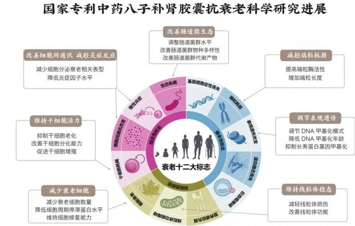 在国际药学领域SCI期刊(《生物医学与药物治疗》,影响因子7.419)发表过的题为《八子补肾延缓自然衰老小鼠表观遗传衰老并延长其健康寿命》的论文首次揭示了创新中药八子补肾胶囊通过逆转DNA甲基化衰老而延缓整体衰老的作用机制。自然衰老动物模型服用八子补肾胶囊11周后观测其DNA甲基化水平,相当于人类年轻了15岁。