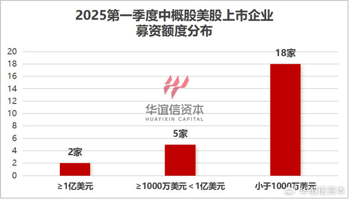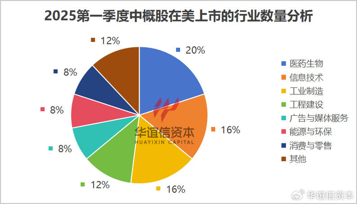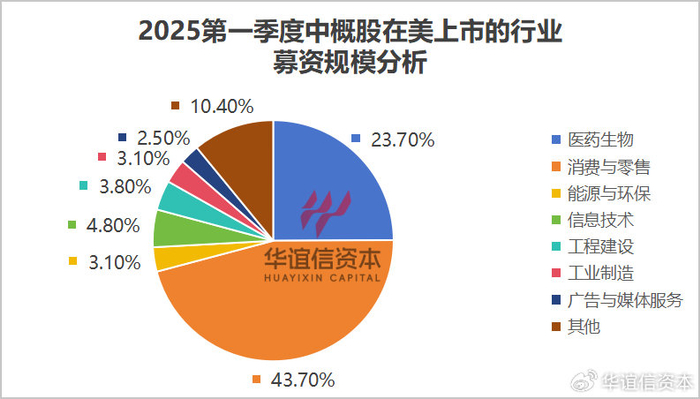 根据华谊信资本数据统计发现,2025年第一季度中概股在美上市的行业数量显示,医药生物行业占据数量优势,共有5家公司(20%),但消费行业募资规模最大,消费行业占全行业总募资的43.7%,史密斯菲尔德(食品加工)单家募资26,000万美元,拉高了消费行业的整体规模。信息技术领域公司数量较多(4家),但募资规模较小(合计2,928万美元),表明多为中小型科技企业上市。