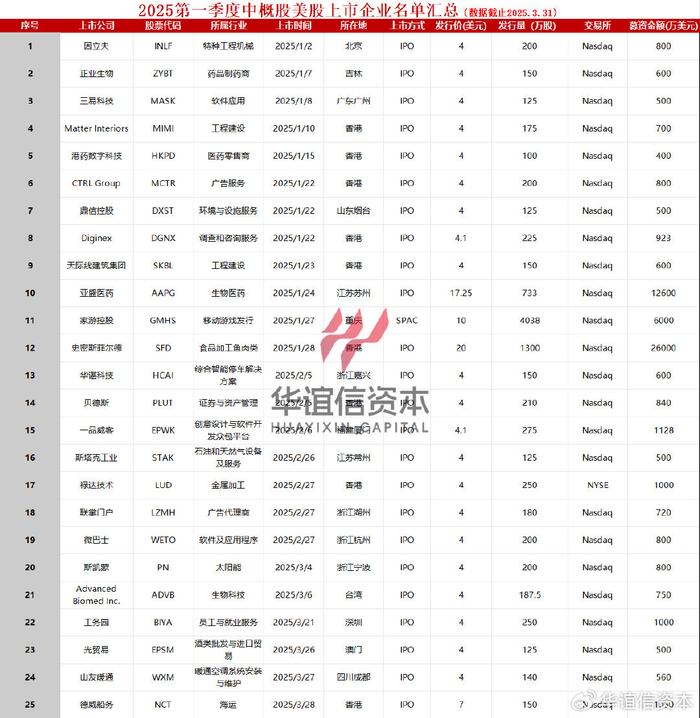 据华谊信资本统计,截至2025年3月31日,2025年第一季度美股共有25只新股上市,募资总额达6.671亿美元,港股共有17只新股上市,募资总额达 171.69 亿港元。