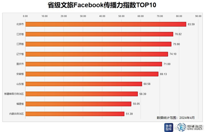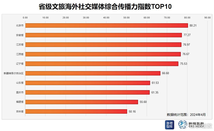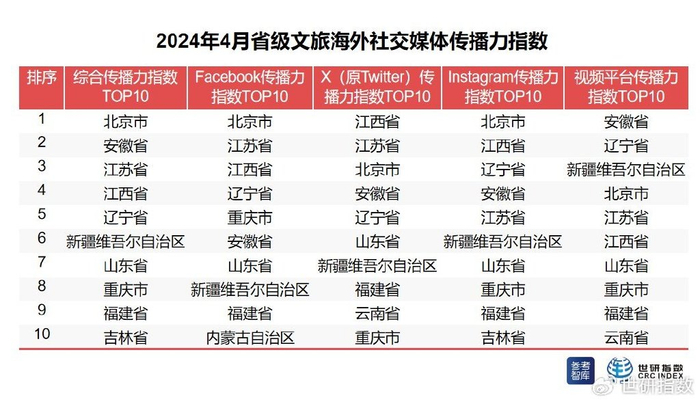 参考消息报道参考智库与世研指数日前联合发布“中国省级文旅海外社交媒体传播力指数(2024年4月号)”。本指数以2024年4月1日至4月30日为监测周期。数据覆盖范围为5个海外社交媒体平台:Facebook、X(原Twitter)、Instagram,视频平台YouTube和TikTok。监测范围覆盖31家省级文旅官方账号(不含港澳台)。