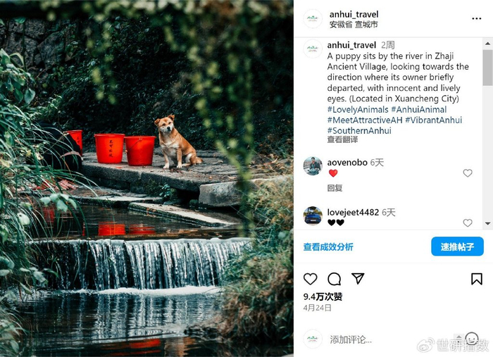 图片是Instagram平台中主要的传播载体。利用图片创造的氛围感和特有的图片语言,往往可获得“无声胜有声”的传播效果。如安徽省文旅账号4月24日发布一篇图文网帖,描绘了一只小狗蹲坐在查济古村河畔,望着主人离开的方向,眼神天真而灵动。它乖巧可爱的模样为这座千年古村落注入了一股鲜活的生命力,有利于让海外受众深刻感受到这里温暖宁静的生活氛围,产生共情效果。截至统计日,该网帖获得9.4万次点赞。