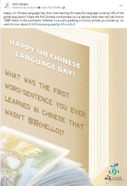 每年4月下旬,中国都会迎来传统节气“谷雨”。目前,这一天已被定为联合国中文日。为表庆祝,江苏省文旅邀请粉丝在评论中分享除“你好”之外的所学到的第一个汉语单词或短语。该互动活动增强了海外受众的参与感,在促进海外受众了解中文及中华文化的同时,也提升了江苏省文旅的海外知名度。截至统计日,该网帖获得超过1.3万互动量。