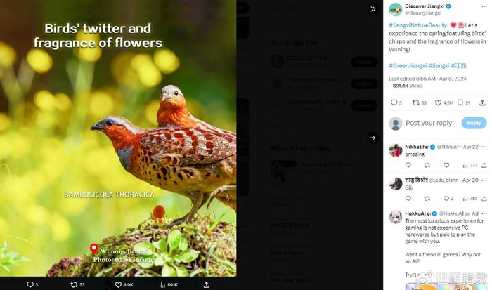 在推进国际传播过程中,除宏大的家国叙事,对细节的展示也是提升中国省级文旅海外影响力的有效手段。例如江西省文旅账号4月8日发布了一篇以“鸟语花香”为主题的网帖。其通过精美的图片和文字展现江西自然之美,传播效果良好。截至统计日,该网帖获得近5000次互动。