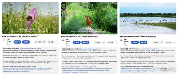 动态视角是视频平台的传播特点之一,相比静态的文字和图片组合,视频平台特有的感官冲击能够使海外受众留下深刻印象。新疆维吾尔自治区文旅账号4月在YouTube平台发布了声动新疆(The Sounds of Xinjiang)主题视频,以昆虫、动物的鸣叫声作为引子,小切口、多视角地展示新疆良好的生态环境和百姓的幸福生活。以“声音”为主线,加以唯美的视觉意象,从“听觉+视觉+意象”的角度,呈现新疆多地独具特色的原生态画面。视频通过独特视角,为海外受众呈现了一个可亲可爱的“治愈系”新疆。该视频被海外受众广泛关注,截至统计日,该视频获得9.2万次播放量。