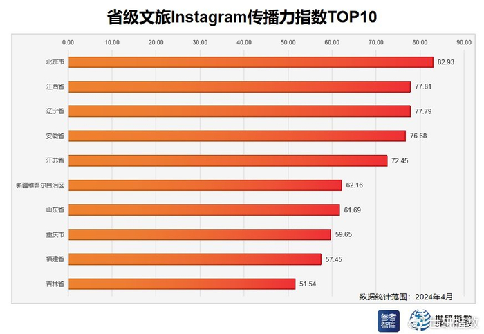 2024年4月,中国省级文旅Instagram传播力指数排序前十的是:北京市、江西省、辽宁省、安徽省、江苏省、新疆维吾尔自治区、山东省、重庆市、福建省、吉林省。