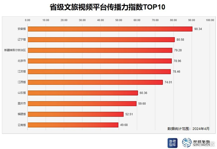 2024年4月,中国省级文旅视频平台传播力指数排序前十的为:安徽省、辽宁省、新疆维吾尔自治区、北京市、江苏省、江西省、山东省、重庆市、福建省、云南省。