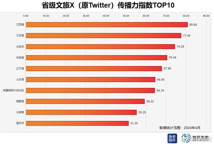 2024年4月,中国省级文旅X(原Twitter)传播力指数排序前十的为:江西省、江苏省、北京市、安徽省、辽宁省、山东省、新疆维吾尔自治区、福建省、云南省、重庆市。