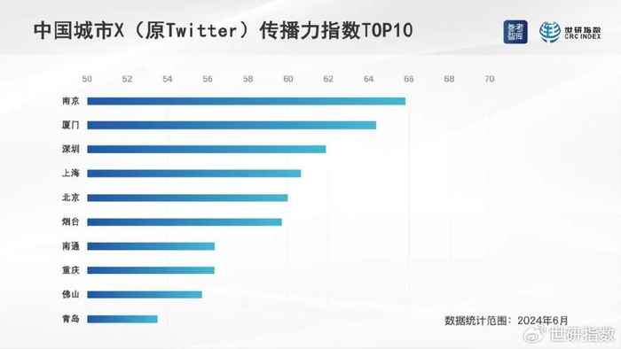 2024年6月,中国城市X平台传播力指数排序相对靠前的城市是:南京、厦门、深圳、上海、北京、烟台、南通、重庆、佛山、青岛。