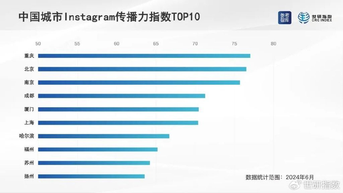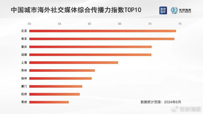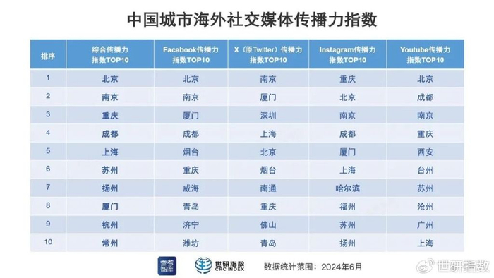 参考智库与世研指数日前联合发布“中国城市海外社交媒体传播力指数(2024年6月号)”。本指数以2024年6月1日至30日为监测周期,以133个中国城市为监测目标,数据覆盖范围为4个海外社交媒体平台:脸书(Facebook)、X平台、照片墙(Instagram)和优兔(YouTube)。
