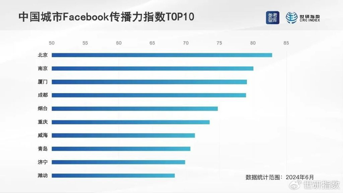 2024年6月,中国城市脸书传播力指数排序相对靠前的城市是:北京、南京、厦门、成都、烟台、重庆、威海、青岛、济宁、潍坊。