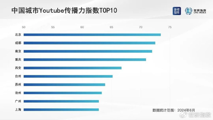 2024年6月,中国城市优兔传播力指数排序相对靠前的城市是:北京、成都、南京、重庆、西安、台州、苏州、沧州、广州、上海。