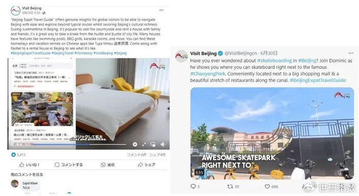 如6月23日,其脸书账号发布了一则外籍人士旅游指南,介绍民宿相关情况;又如6月30日,其X平台账号发布朝阳公园“滑板圣地”的介绍,向海内外滑板爱好者提供了北京旅游的打卡地之一,亦取得了良好的传播效果。
