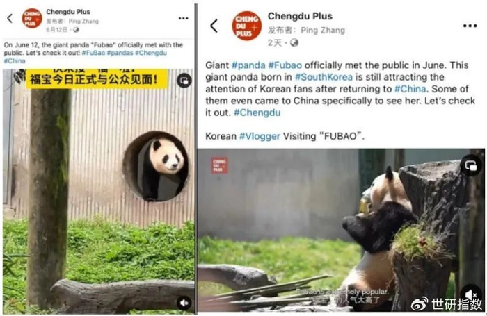 如在旅韩大熊猫“福宝”回国之际,成都脸书平台账号发布《福宝在成都的生活》《大熊猫“福宝”正式亮相》《大熊猫“福宝”》等系列视频,总覆盖人数超4.3万,获赞超3000次,播放量超4万。