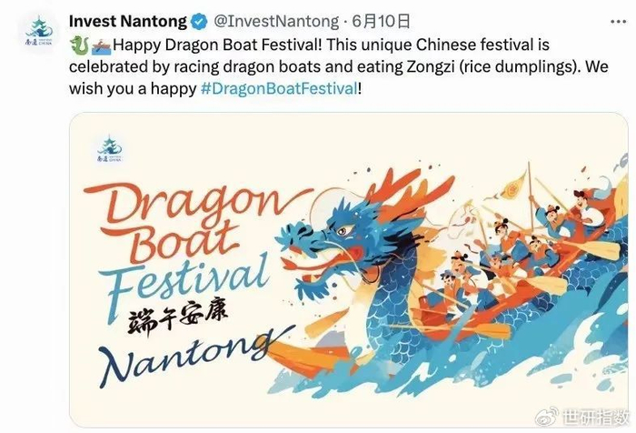 以中国传统节日为契机的国际传播策略,也在本监测周期内被中国城市广泛应用,通过这一策略,南通在上述维度同样表现不俗。6月,南通账号“Invest Nantong”围绕传统节日端午节进行议题策划,发布南通龙舟竞渡、水上表演视频以及龙舟赛国际参与者等相关内容。其中,端午龙舟竞渡视频曝光量达168.9万次,互动量达5792次;水上活动视频曝光量达66.7万次,互动量达2706次。端午节手绘主题海报曝光量达16万次,互动量达2575次。