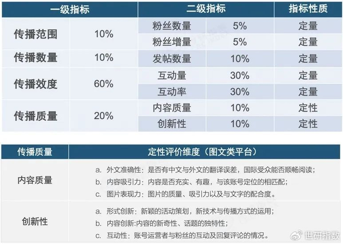 “中国城市海外社交媒体传播力指数”以中国城市主要官方账号为指数评估主体,依据其在多个海外社交媒体平台上的多维度传播数据,通过指数模型运算,实现对城市国际传播效力的指数得分。根据各平台的全球用户规模、活跃度、影响力相关度等因素动态设定平台权重,各平台指数加权计算形成综合传播力指数。国际传播力指数体系算法包括定性与定量两部分。其中,定量指标权重占比80%,定性指标权重占比20%。