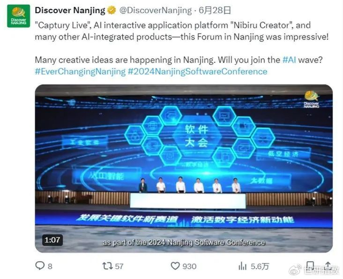 围绕“2024南京软件大会”,南京X平台账号聚焦2024"N+"AI互动创新论坛活动,相关网帖展现了AI视频虚拟广告、AR在教育中的应用、AI智能眼镜产品、AI在出版行业的应用等内容,进一步强化南京作为“科技创新城市”的海外形象“标签”。在监测时段内,相关视频互动量达1024次、播放量达15137次。