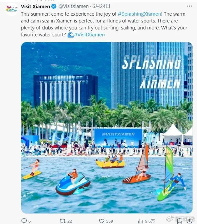 季节性旅游项目也是本监测周期内中国城市形象宣传的重点议题之一。滨海城市厦门,其水上运动一直是夏季的旅游热点项目。6月24日,厦门账号开启#SplashingXiamen话题,介绍冲浪、帆船、游艇等夏季水上运动,收获较好的关注度。