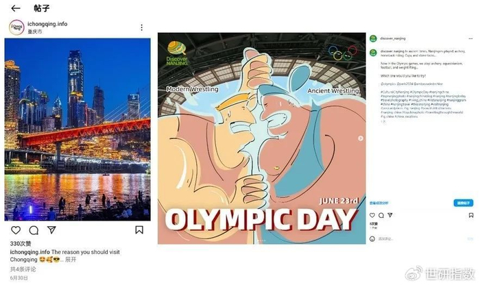 2024年恰逢“奥运年”。随着巴黎奥运会的临近,该议题正成为海外社交媒体关注的热门话题。在国际奥林匹克日,南京账号策划了一组奥运主题海报。每张海报均融合了奥运五环标志,背景则选用南京奥林匹克体育中心,既体现出运动的力量与美感,又凸显了南京在体育方面的独特城市魅力。截至统计日,上述海报曝光量超过4594次。