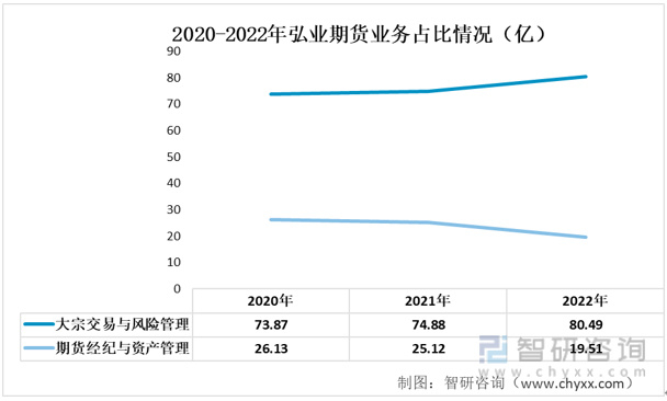 近年来弘业期货的大宗交易与风险管理业务收入占比呈现上升的态势,而期货经纪与资产管理业务占比呈现下降的态势。2022年两大业务的占比分别为80.49和19.51%。