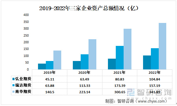 从2019年到2022年期间三家期货企业的资产总额来看,整体均呈现增长趋势。其中,南华期货资产总额最高,近四年分别为140.5亿、223.14亿、300.65亿和341.89亿;其次是瑞达期货,资产总额近四年分别为63.88亿、113.33亿、173.39亿和157.19亿;弘业期货资产总额最低,近四年分别为45.11亿、63.49亿、80.83亿和104.84亿。
